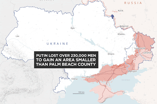 Russia has captured an area of Ukraine equal to about 37% of Palm Beach County. It cost them about 231,480 soldiers.